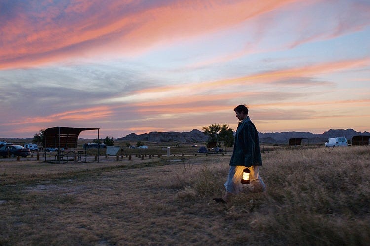 Minha primeira memória é de um movimento, de mudança, na verdade. Do meu primeiro dia de vida até os sete anos, mudei três vezes dentro de São Paulo – batizada assim em homenagem a um pecador convertido. Aos oito anos, deixei a capital para o interior, indo para uma pequena cidade chamada Quintana, em homenagem ao grande poeta. Aos nove, mudei para outra cidade do interior, um pouco maior, chamada Marília, nomeada em referência a Tomás Antônio Gonzaga. Aos dez, voltei para Quintana. Aos onze, mudamos para uma cidade chamada Padre Nóbrega (essa não sei a quem homenageia), e ainda aos onze, voltei para Quintana. Finalmente, aos quinze, voltamos em definitivo para Marília. Dos quinze aos vinte anos, mudei mais três vezes, desta vez dentro do próprio município. Quando, aos vinte e seis, regressei para São Paulo, lá também mudei algumas vezes. E agora, aos trinta, vou para Assis – cidade que homenageia um capitão do genocídio dos povos indígenas, não o escritor. Antes que me perca nos detalhes, é melhor ir ao ponto. Então, sem mais delongas, quero falar sobre o filme Nomadland (2020), de Chloé Zhao.