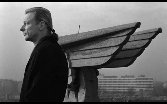 E por último, mas não menos importante, debruçamo-nos agora sobre o filme Asas do Desejo (1987) de Wim Wenders. Neste filme, vemos Berlim, anos 1980, enquanto a cidade é cortada por uma cicatriz em forma de muro, por sobre ela, dois anjos – Damiel (Bruno Ganz) e Cassiel (Otto Sander) – observam a vida humana invisíveis, eles perambulam por bibliotecas, ruínas, apartamentos e ruas, ouvindo os pensamentos mais íntimos dos cidadãos. Damiel, cansado de sua existência eterna de apenas espectar, sente um desejo profundo de experimentar: sentir o sabor do café, tocar a pele de alguém, entender o peso da existência mortal, ele quer sentir a gravidade agir em seus músculos. Sua fascinação cresce ao acompanhar Marion (Solveig Dommartin), uma trapezista de um circo itinerante, cujos pensamentos revelam sua angústia existencial.